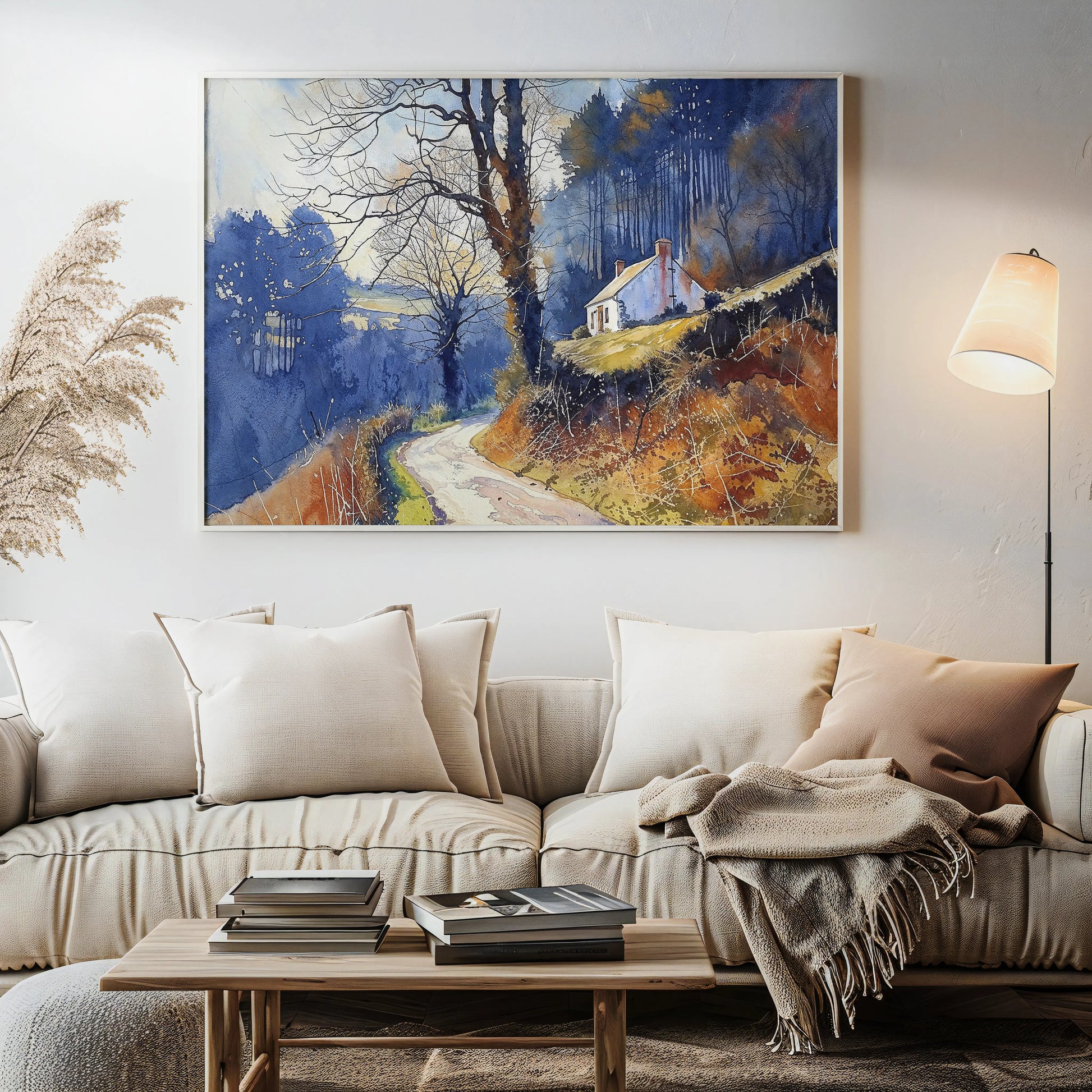 Perfect for those who cherish country escapes, minimalist rural beauty, and the meditative stillness of fall afternoons, this stretched-canvas artwork is a timeless addition to any calm, reflective space.