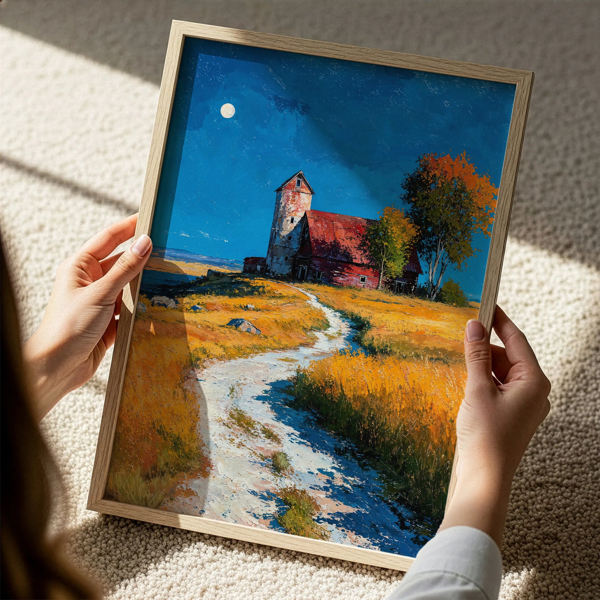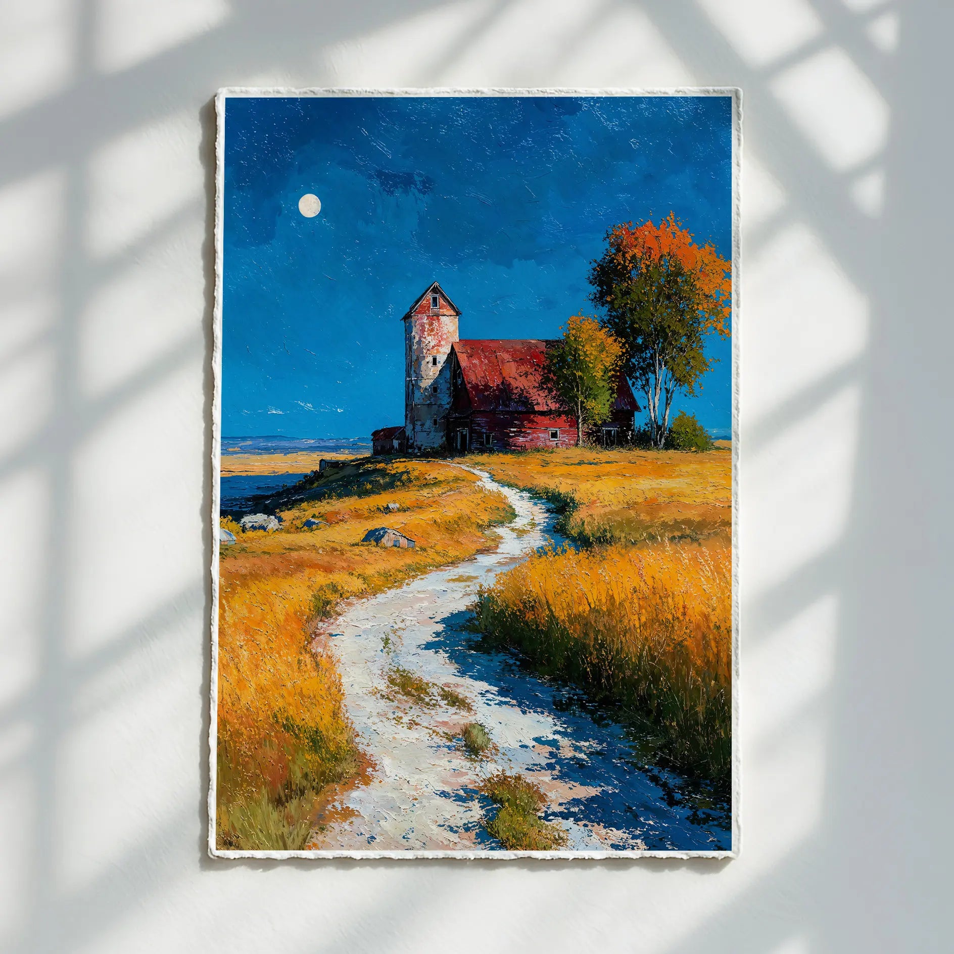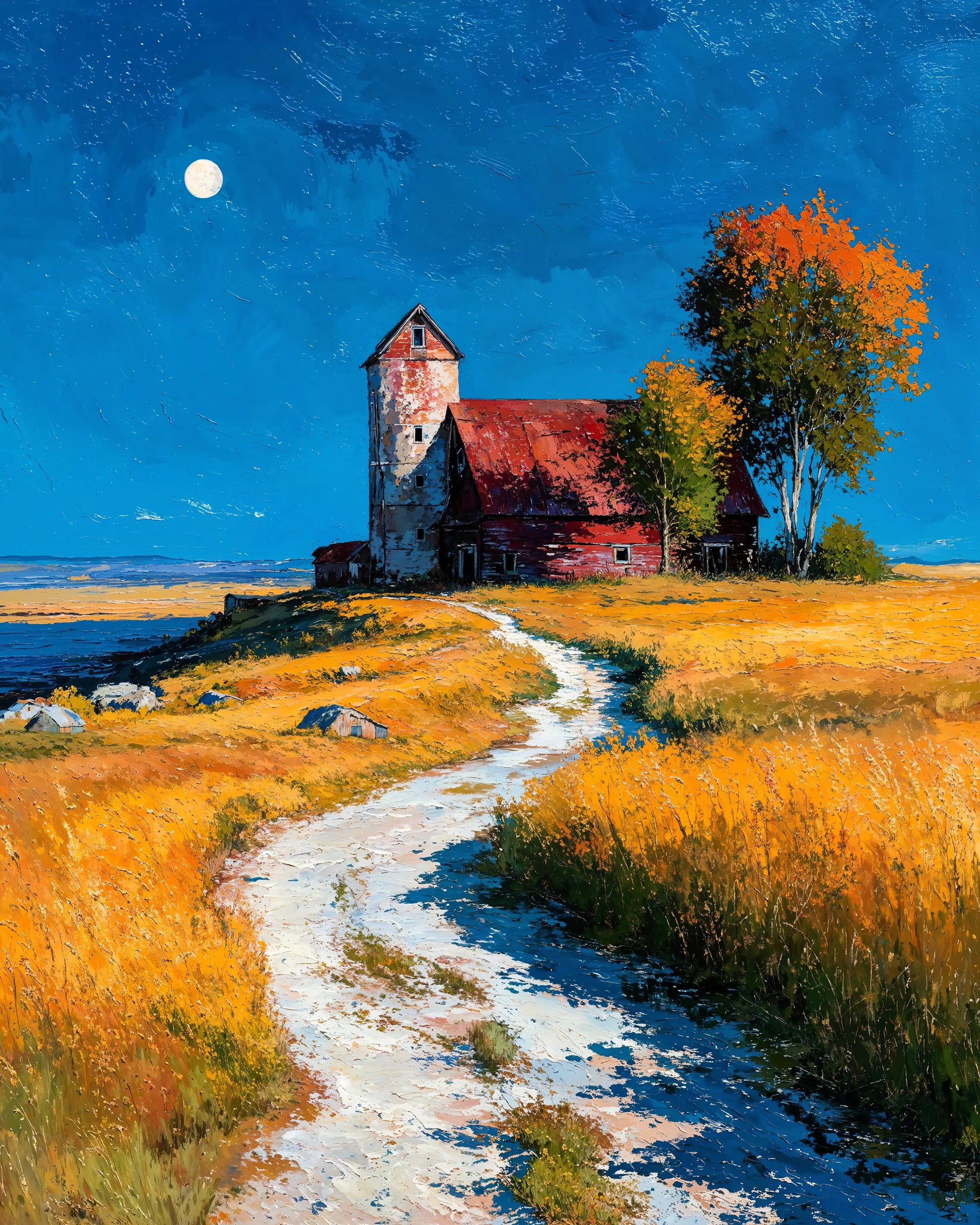In Vega, a crimson barn rests under a vast blue sky, its silhouette softened by moonlight and the golden hush of ripened fields. A white path winds gently through tall grasses, leading the eye toward the barn’s tower and a pair of flame-tipped trees standing like sentinels of season’s change.