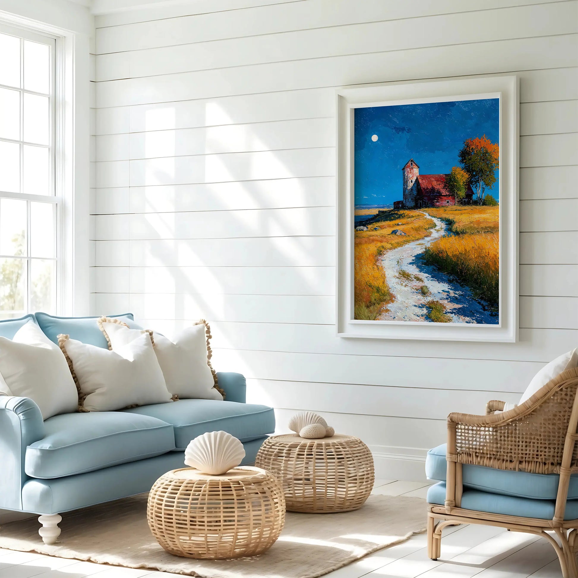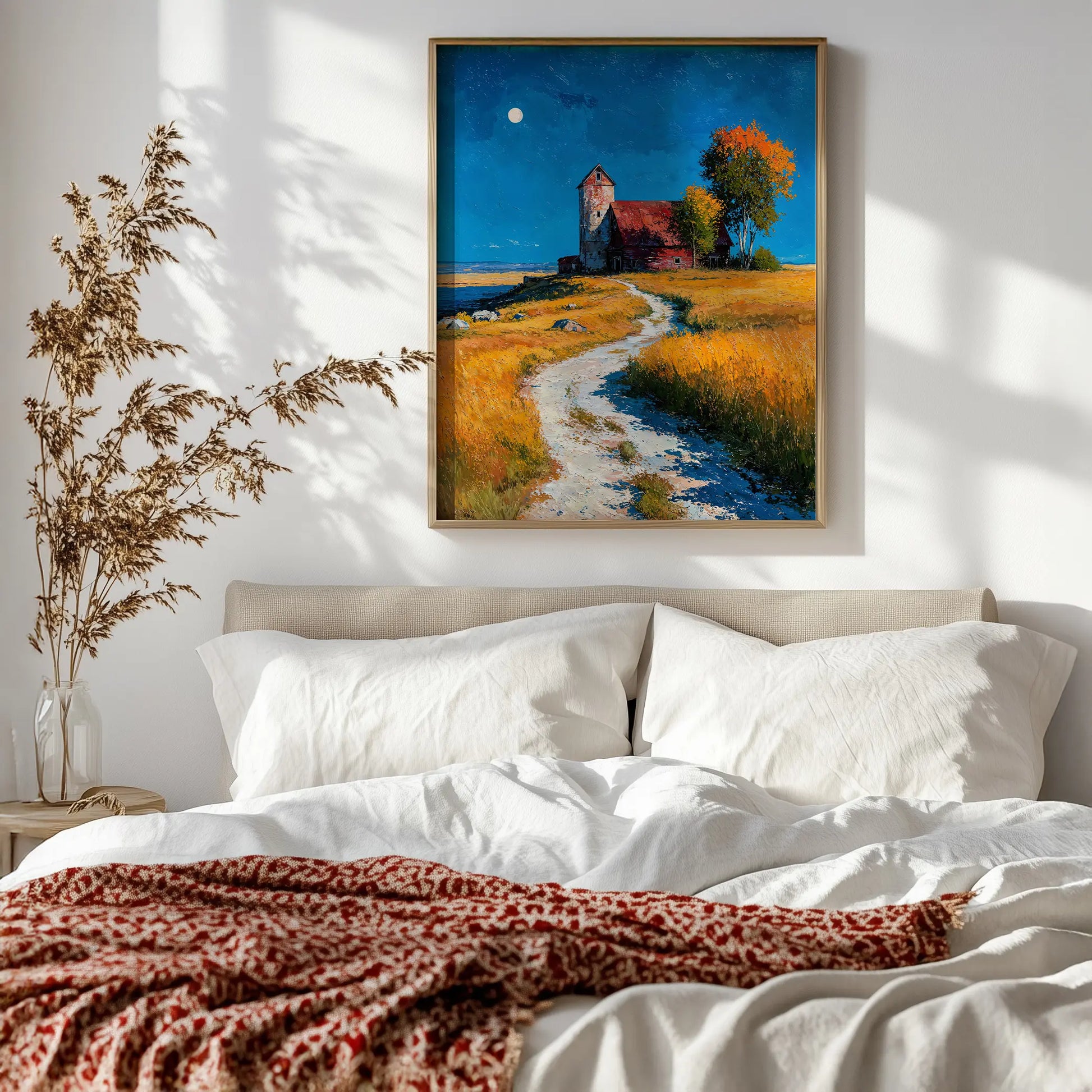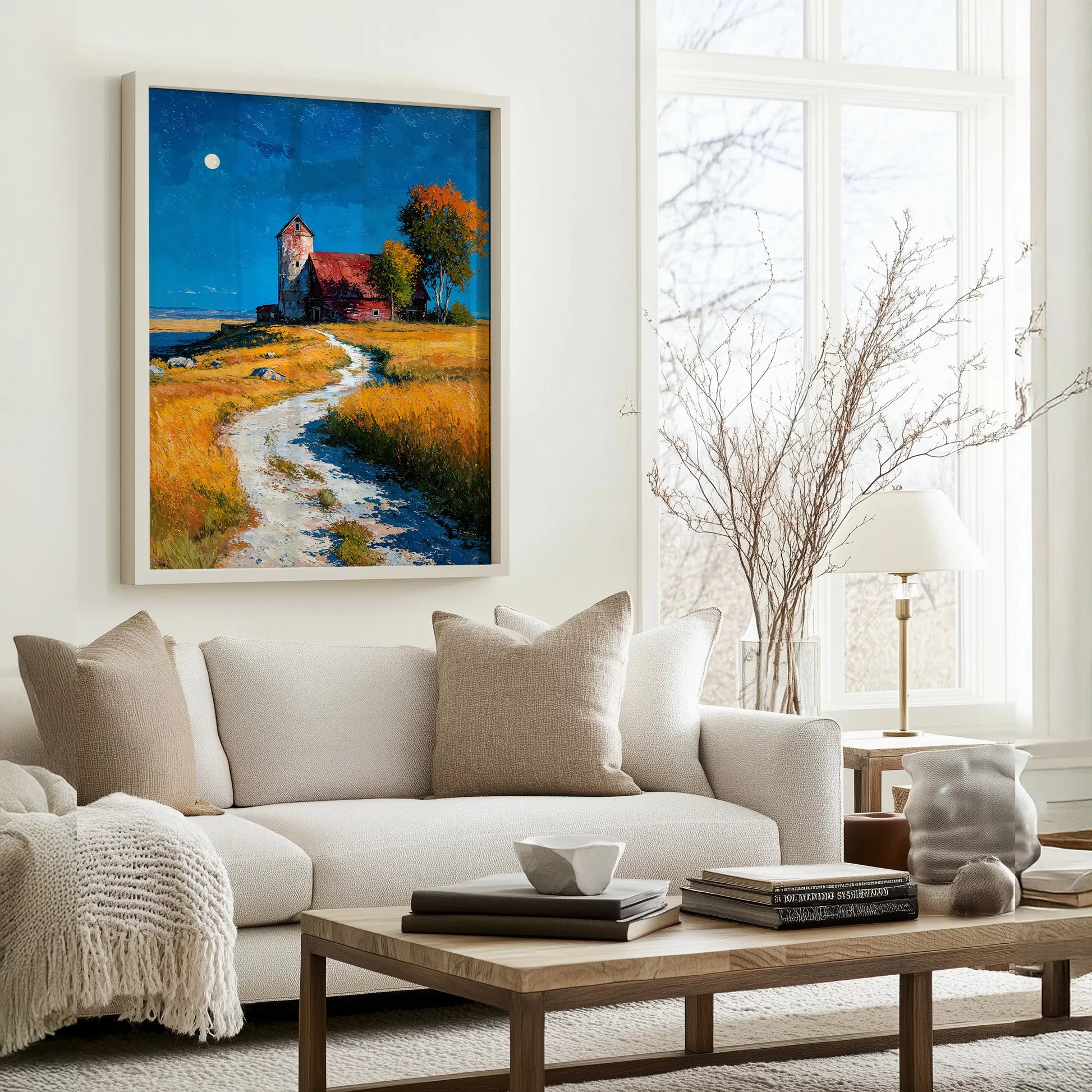 In Vega, a crimson barn rests under a vast blue sky, its silhouette softened by moonlight and the golden hush of ripened fields. A white path winds gently through tall grasses, leading the eye toward the barn’s tower and a pair of flame-tipped trees standing like sentinels of season’s change.
