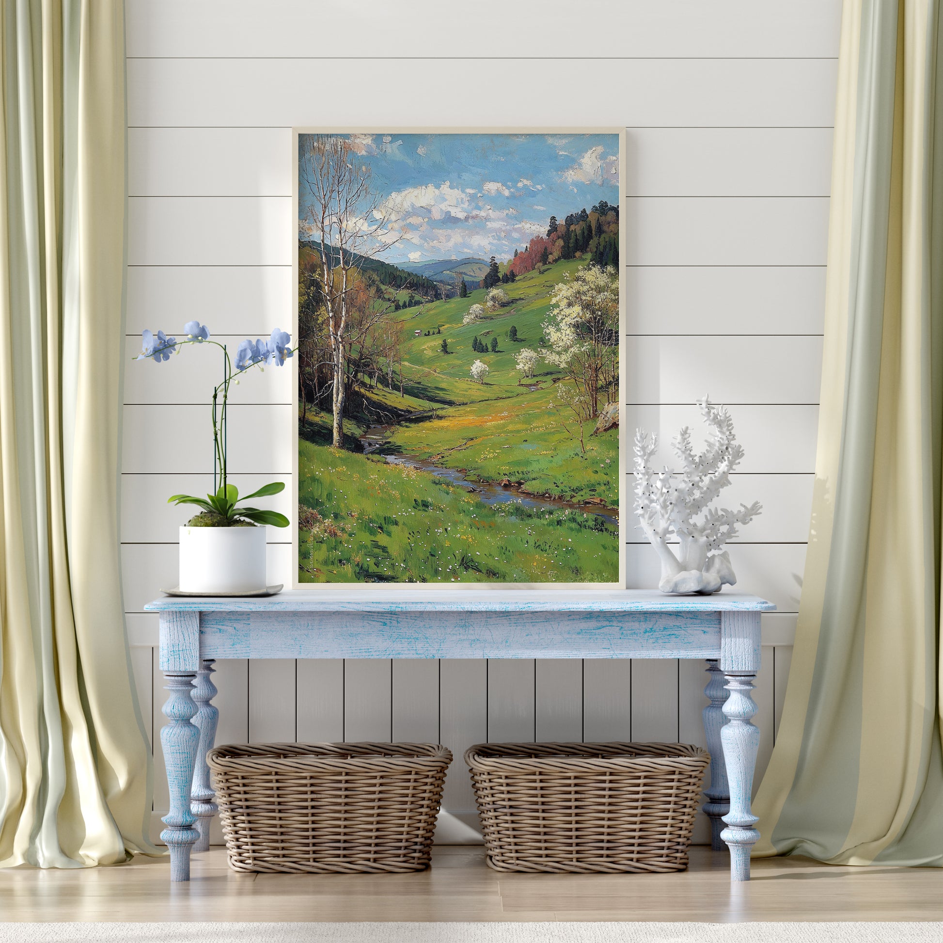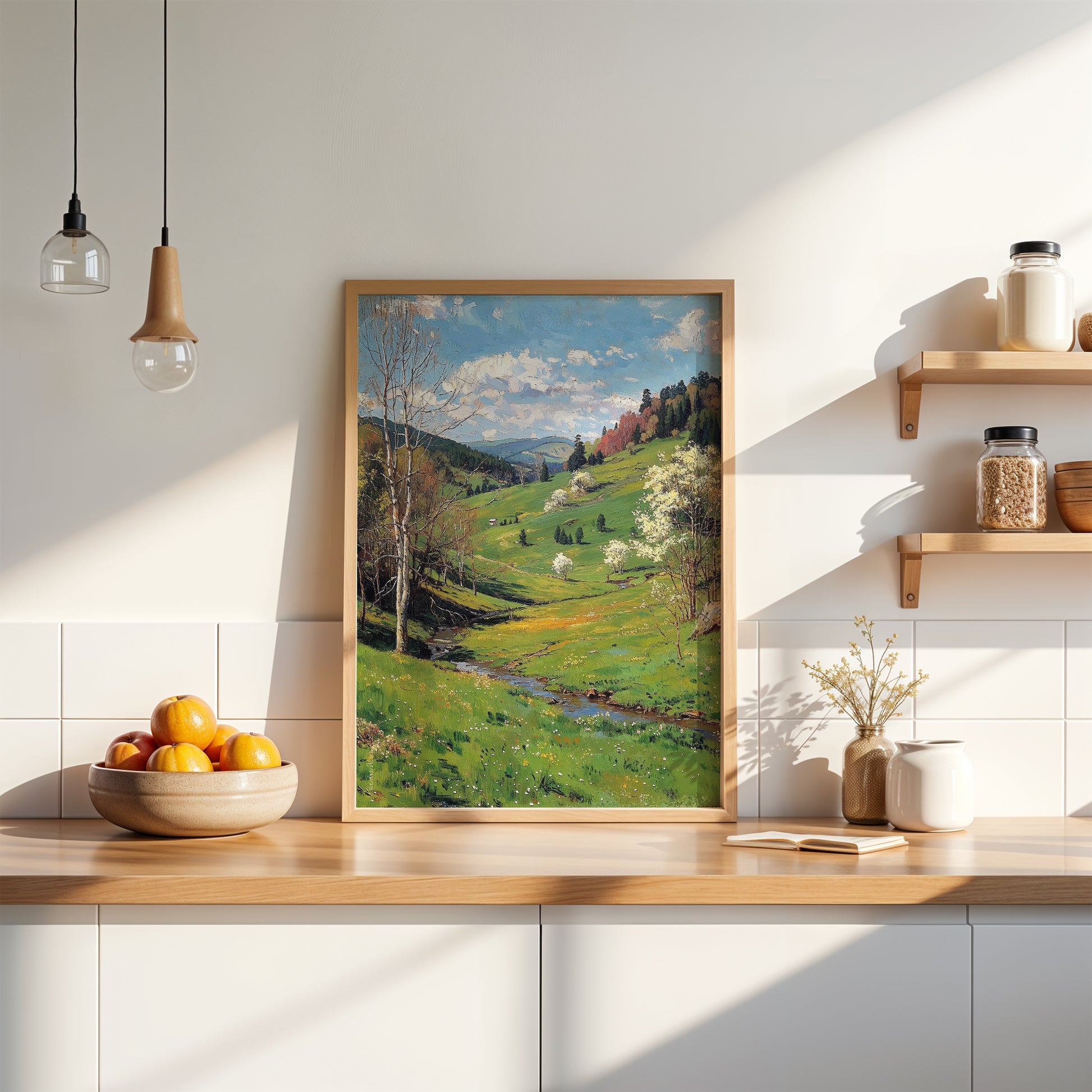 Verdant Hills roll beneath a vast spring sky, where light pools along a quiet stream and distant orchards bloom in scattered rhythm. The scene unfolds with open breath, a composition rooted in diagonal flow and softened horizon lines—inviting the viewer inward with both movement and stillness—every tree, whether bare-limbed or flowering, is given its gesture of rebirth.