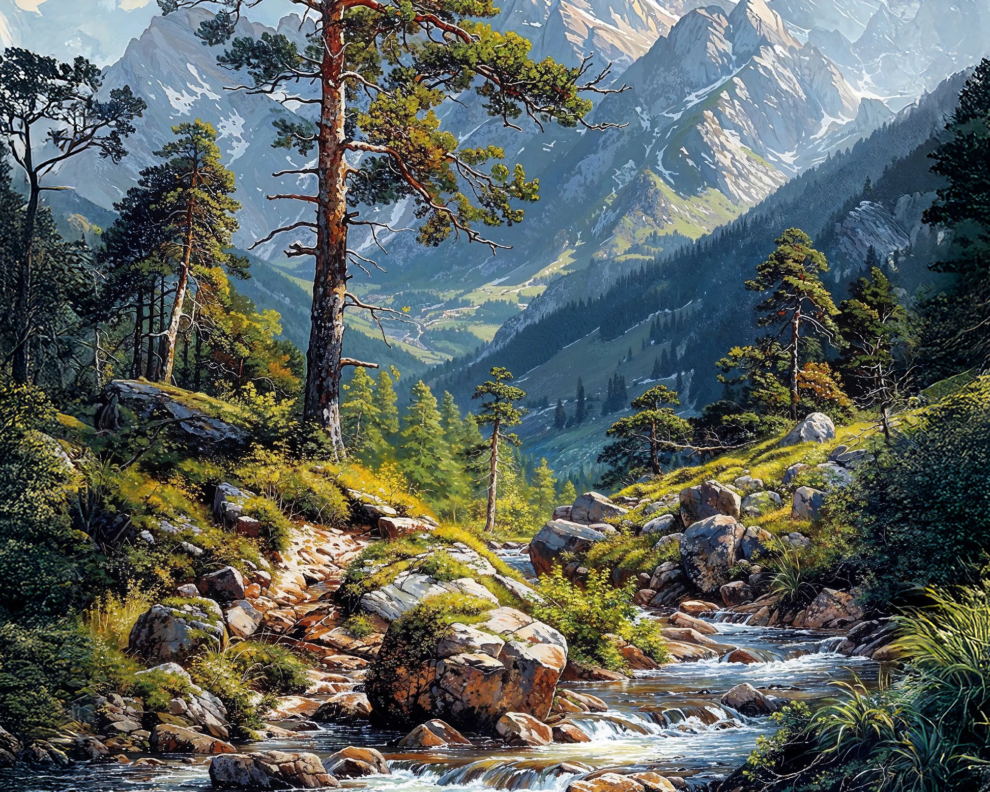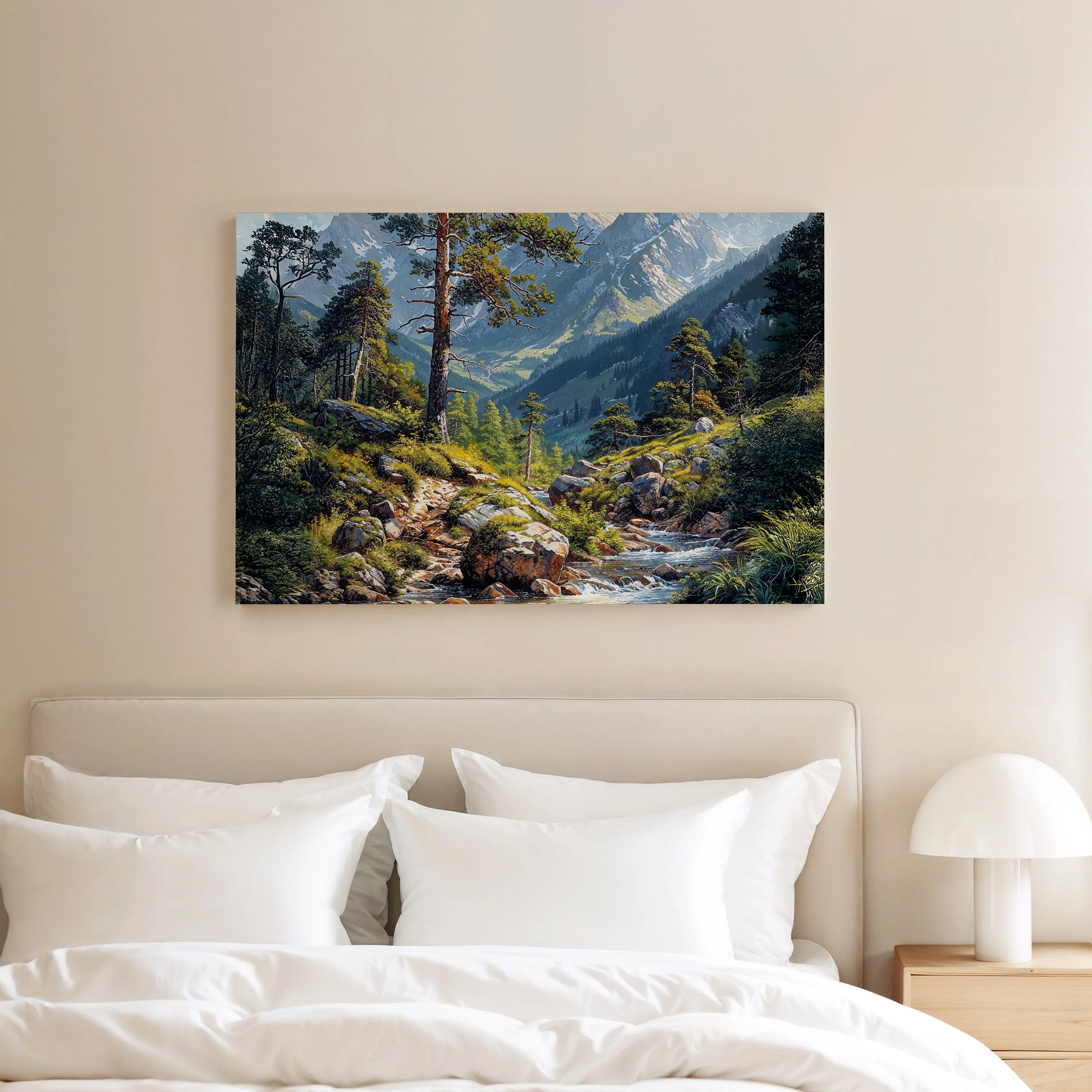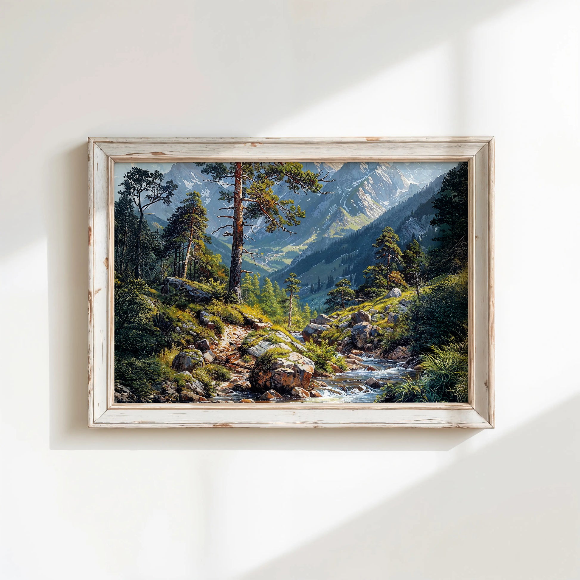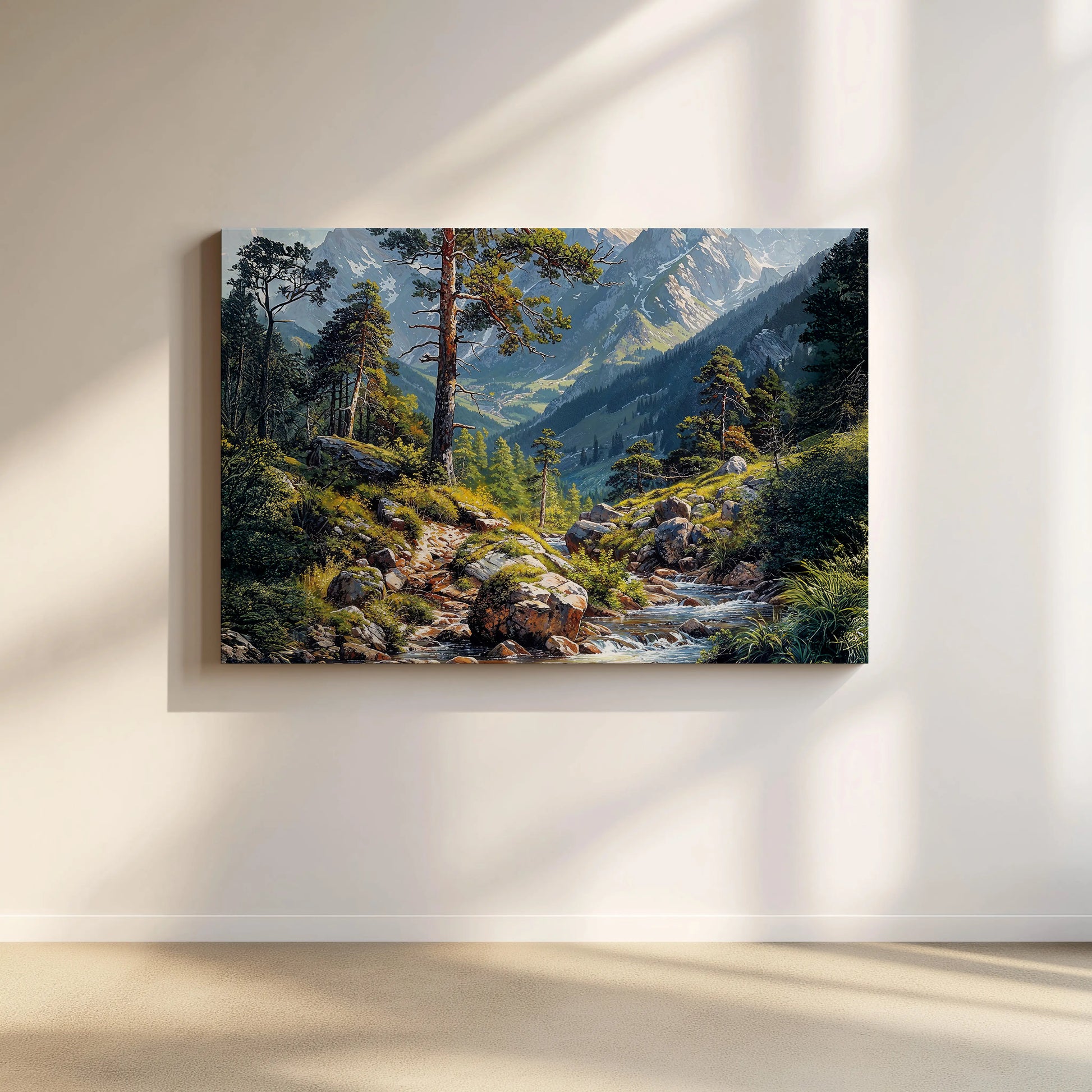 Let the breathtaking beauty of Via Alpina flow into your space. This masterpiece captures the essence of untouched alpine wilderness — a vibrant mountain stream cutting through rocky terrain, surrounded by lush pine forests and framed by towering peaks.