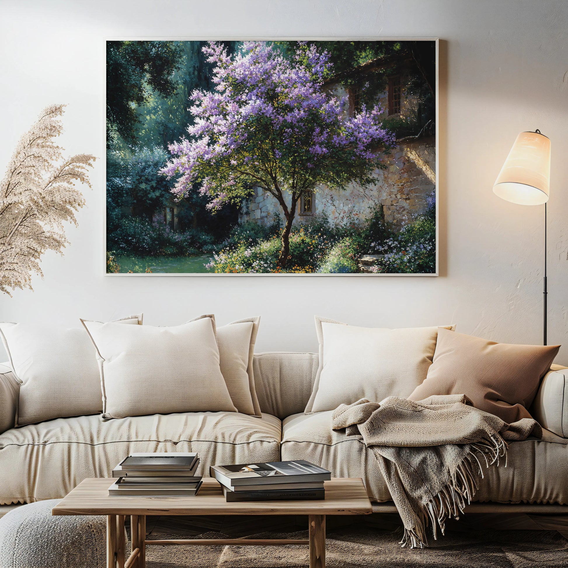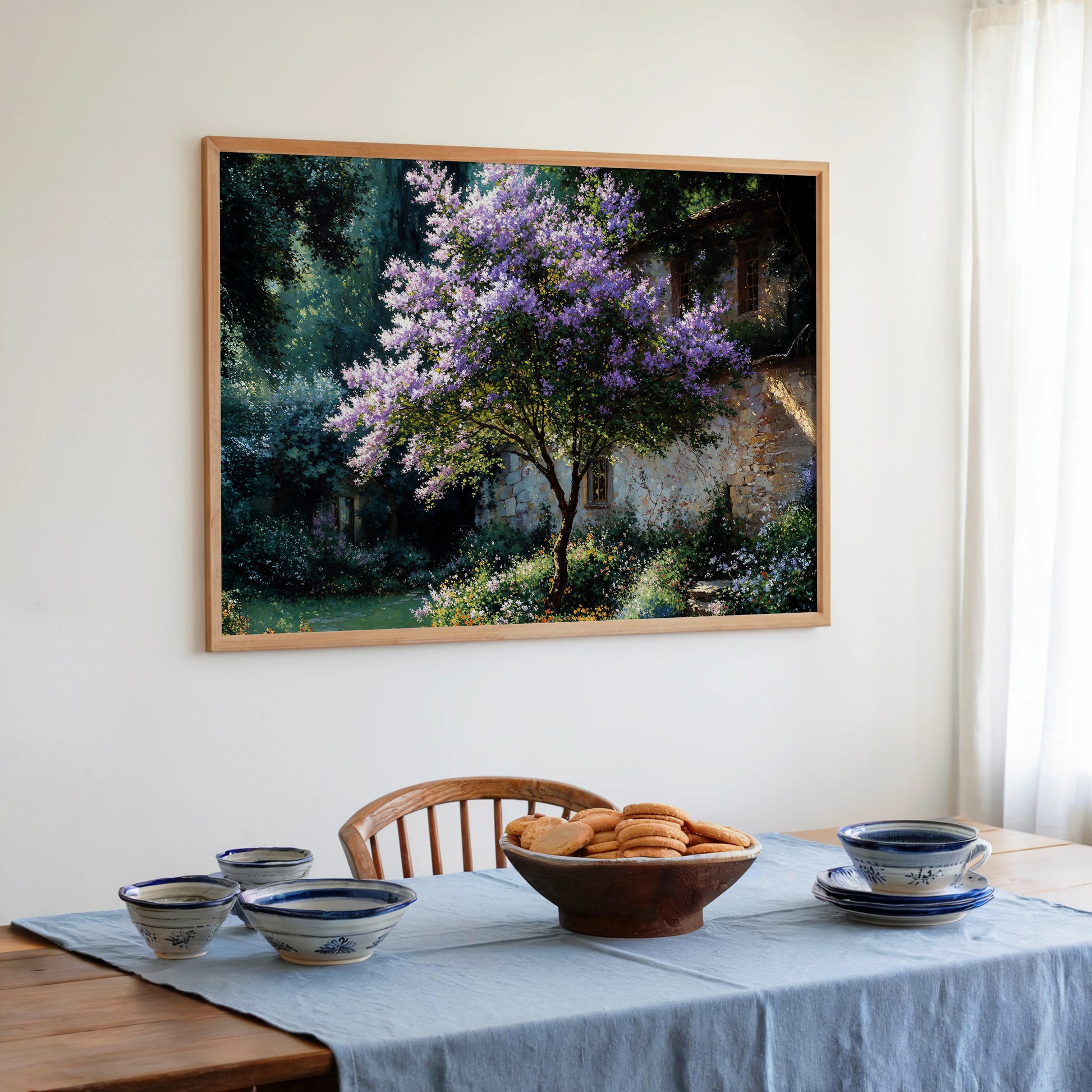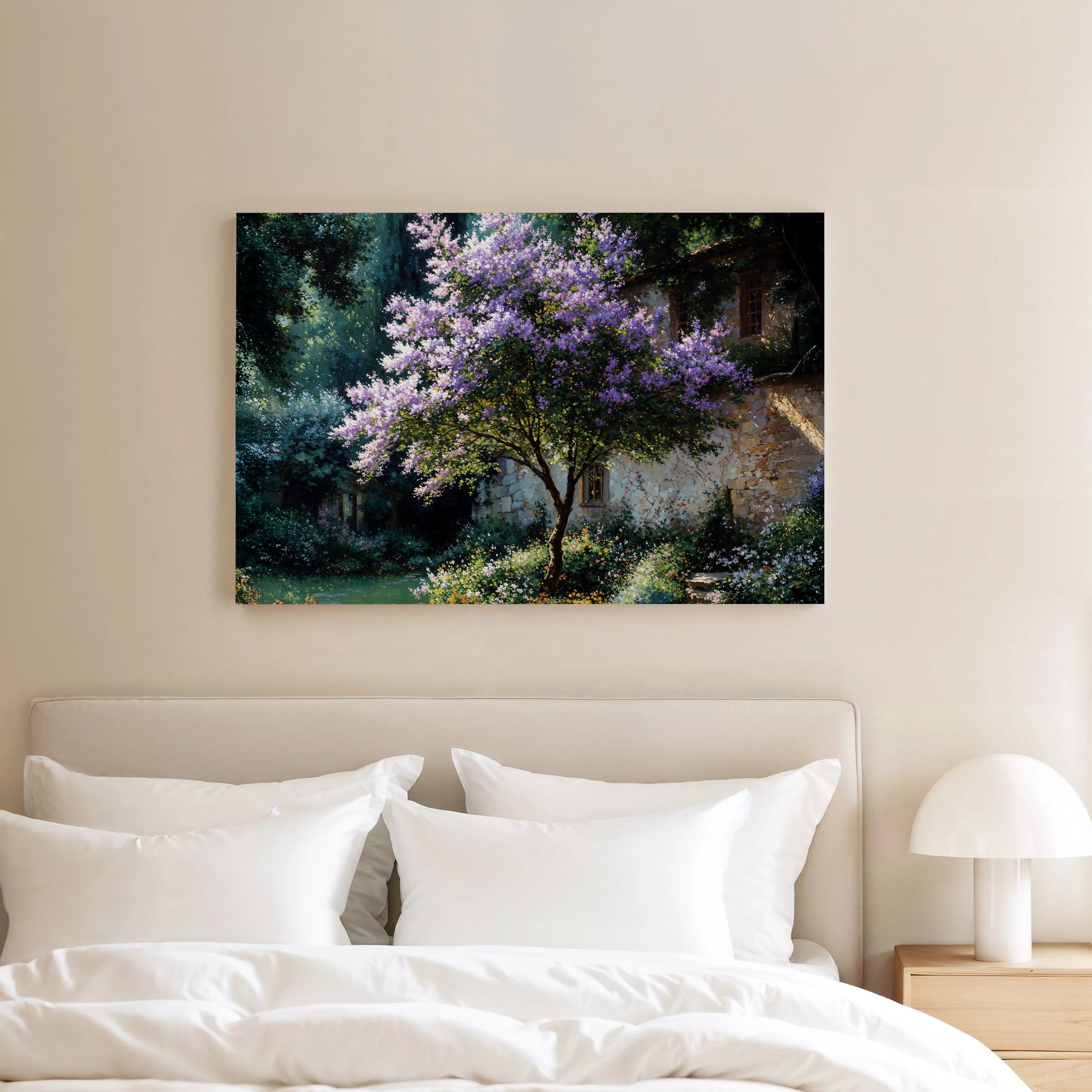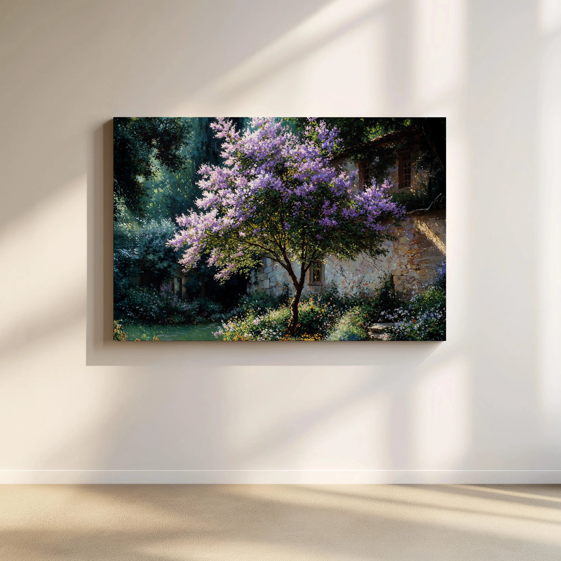 Violet is a gentle celebration of seasonal renewal. At its heart, a lilac tree bursts into bloom beside a timeless stone cottage, its blossoms glowing in dappled sunlight. The surrounding garden overflows with wildflowers, painting the landscape in soft purples, greens, and golds.