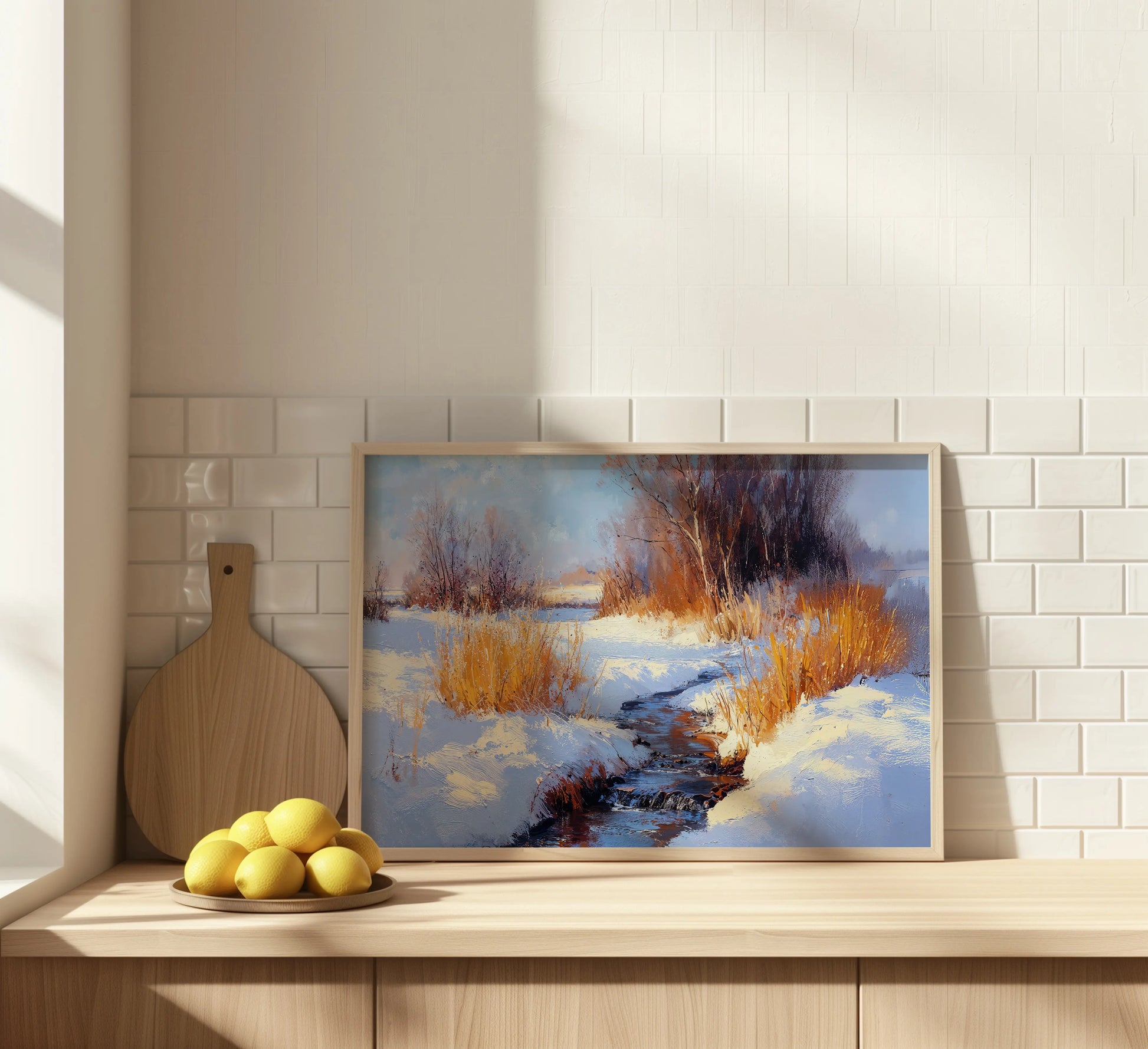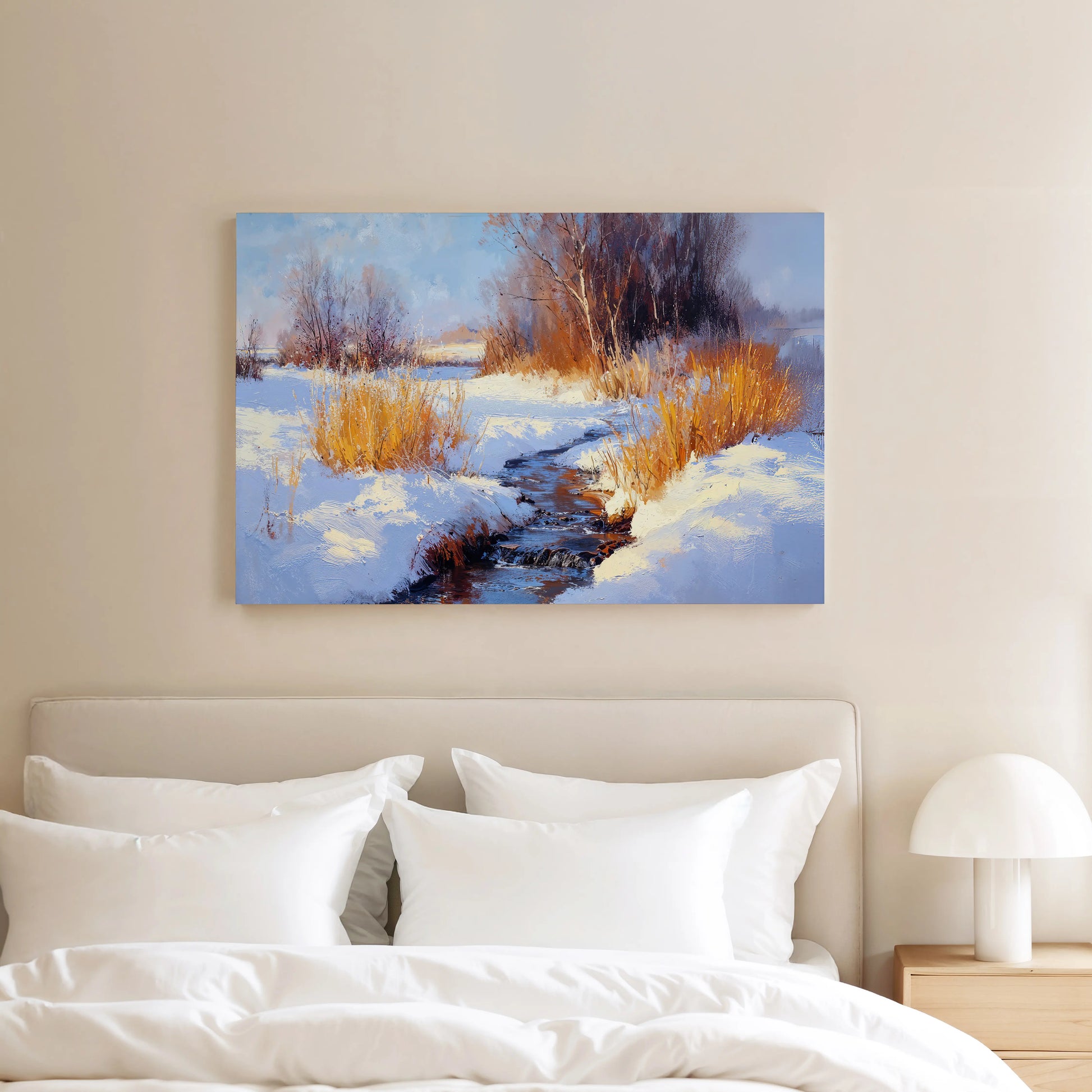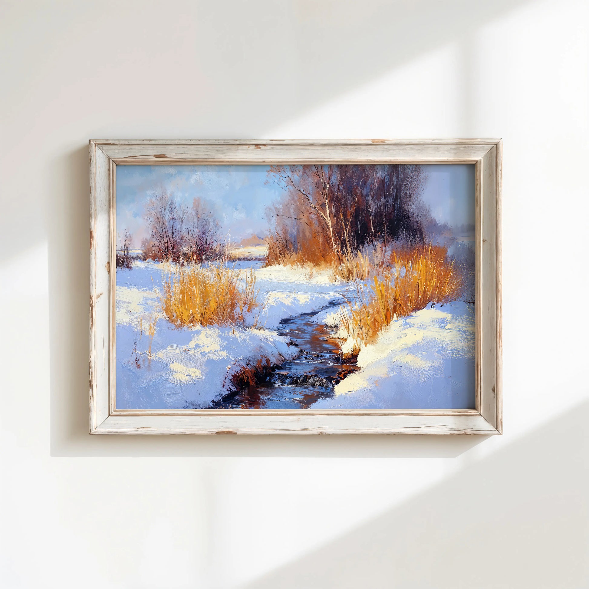 Winter Lullaby captures the quiet beauty of a frozen landscape pierced by a gently flowing stream. Vibrant golden grasses rise from snowy banks, glowing with warmth against the crisp white snow and cool blue sky.