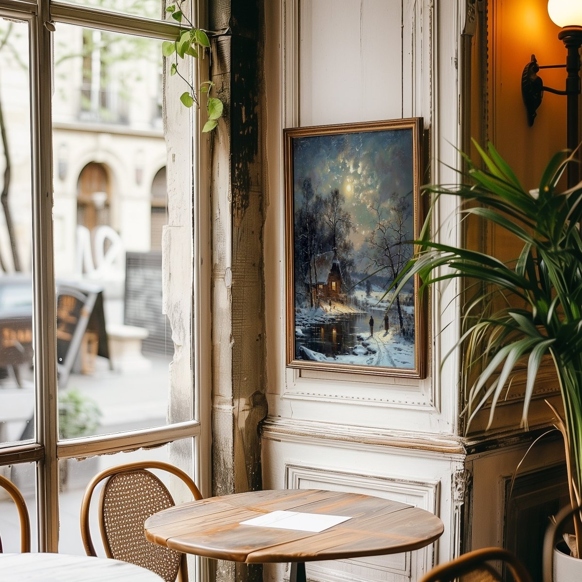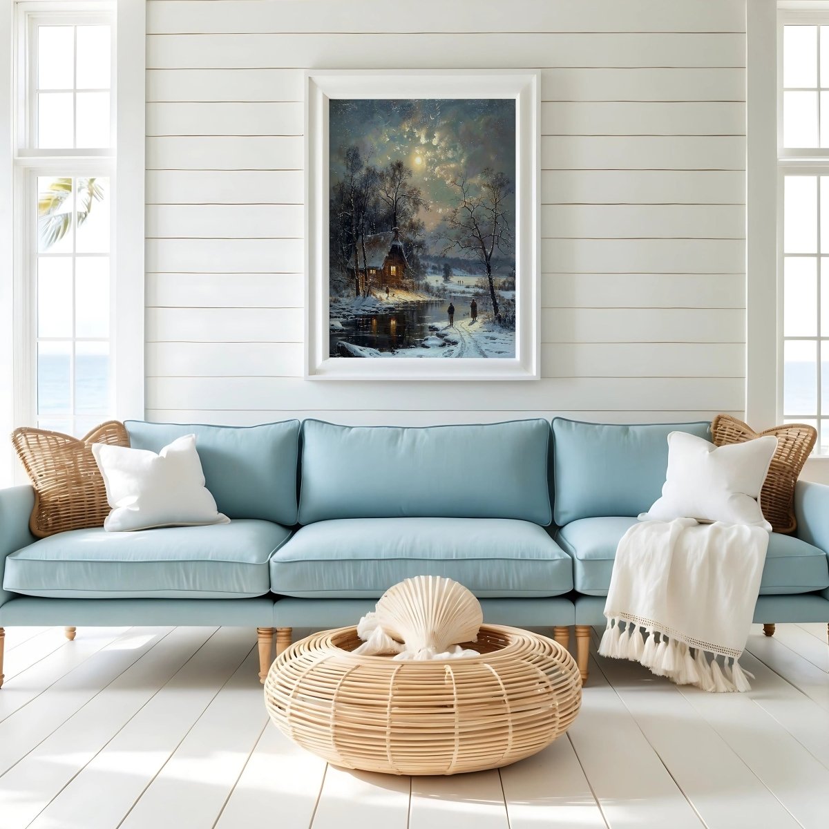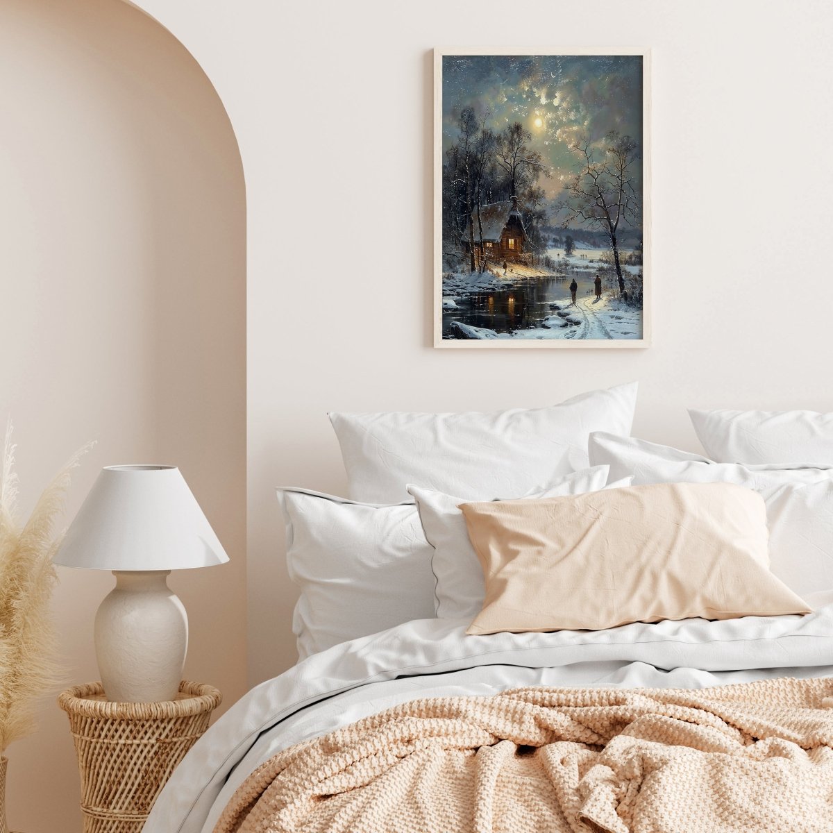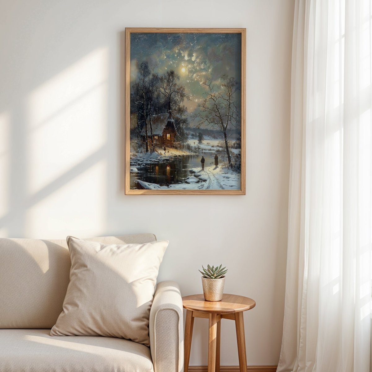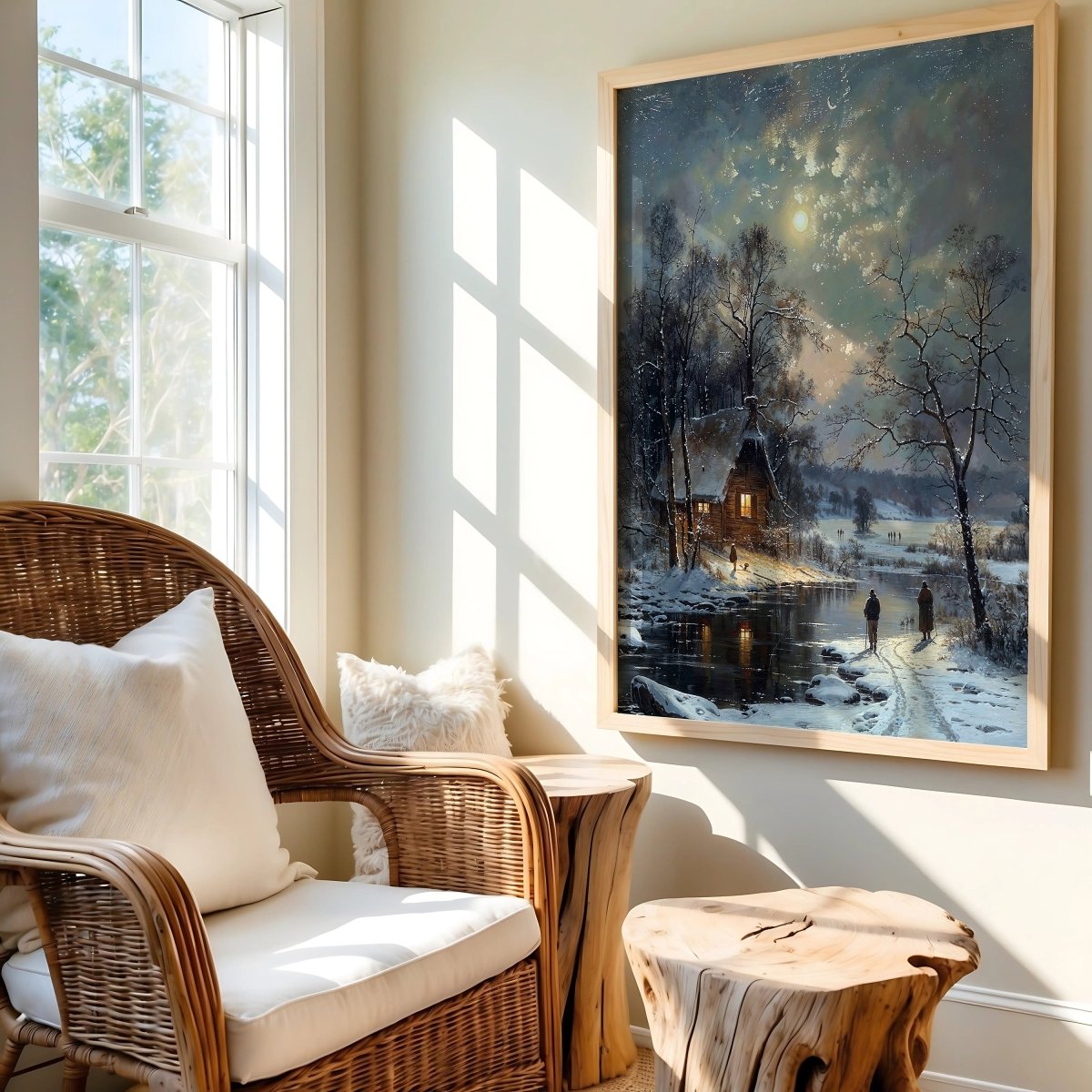 Ideal for winter decor, quiet reading corners, or interiors craving a moment of peace, this piece invites the viewer into a realm of quiet beauty and seasonal grace.