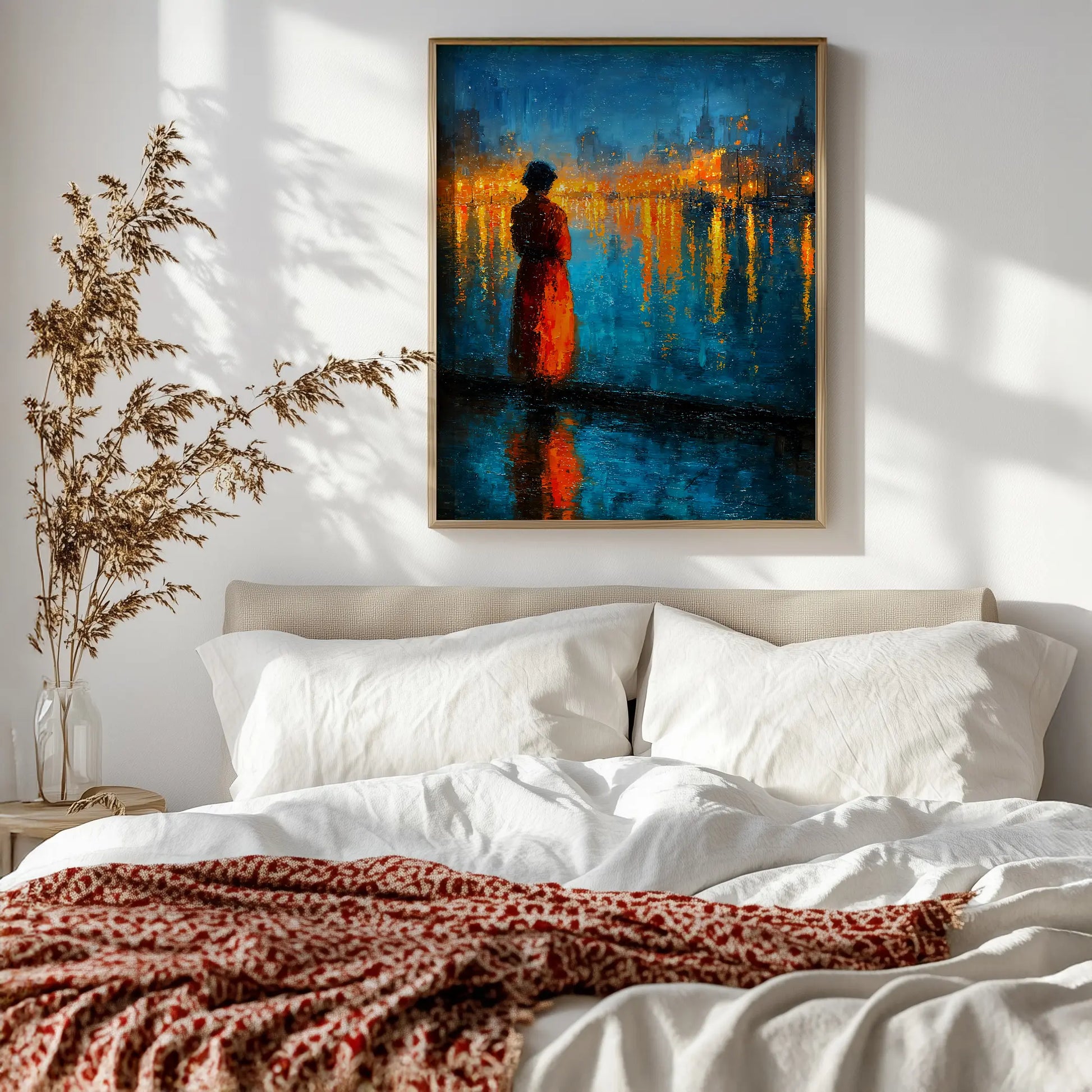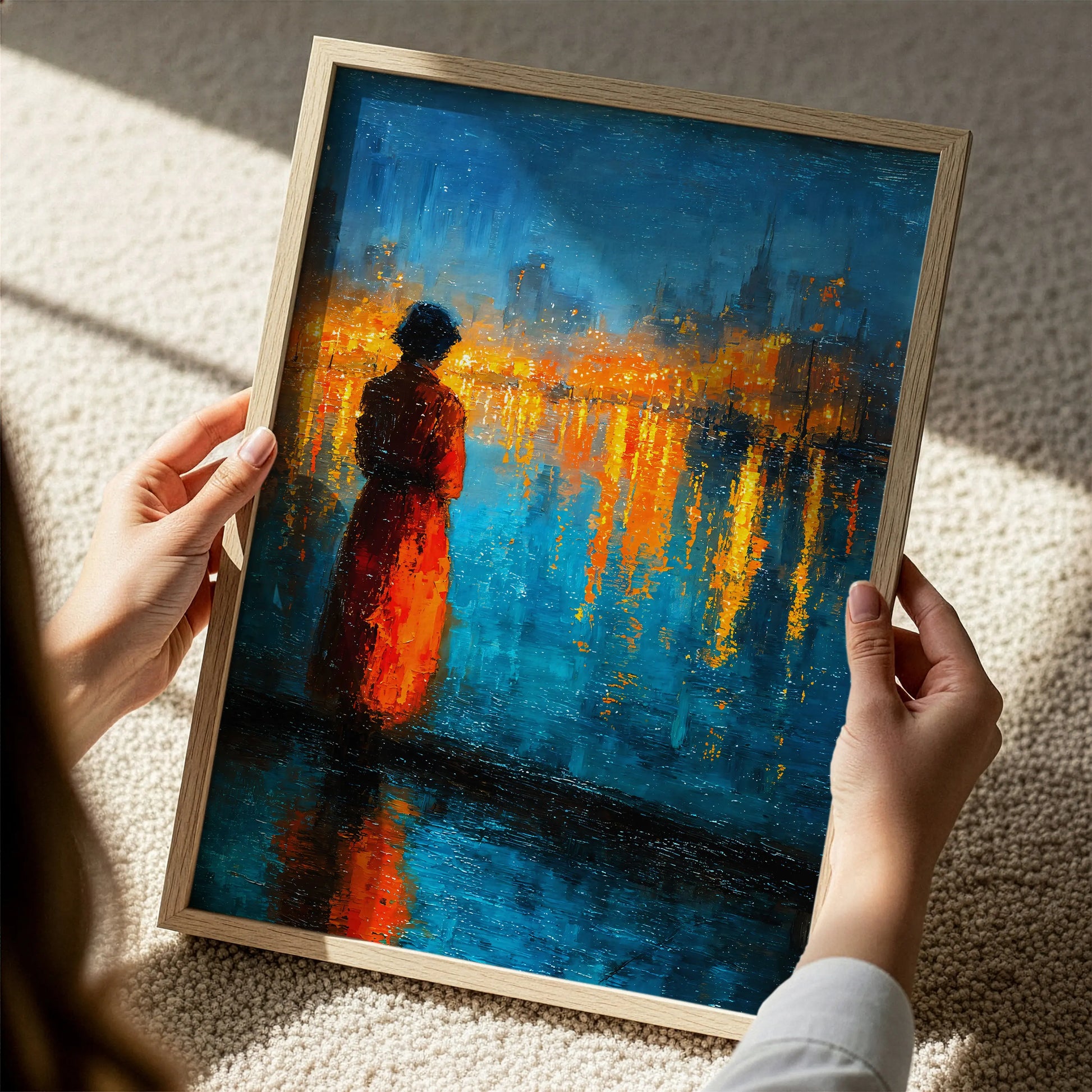 In Yearning, a lone figure in crimson gazes across a river alive with light—each brushstroke a flicker of distant windows, blurred skylines, and imagined connection. The water shimmers with golden reflections, stretching like untold stories between present and possibility.